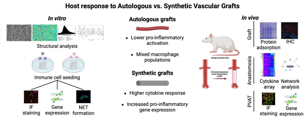 Rohringer et al. evaluated how these materials influence inflammation and healing both in the anastomotic regions, where the graft is joined to the native vessel, and in the perivascular adipose tissue (PVAT), a key but often overlooked component of vascular healing. In vitro and in vivo experiments revealed that autologous grafts elicited minimal early inflammatory responses, while synthetic grafts, particularly ePTFE, triggered stronger activation of pro‑inflammatory cytokines and gene pathways shortly after implantation. TPU/TPUU showed a delayed but noticeable response.